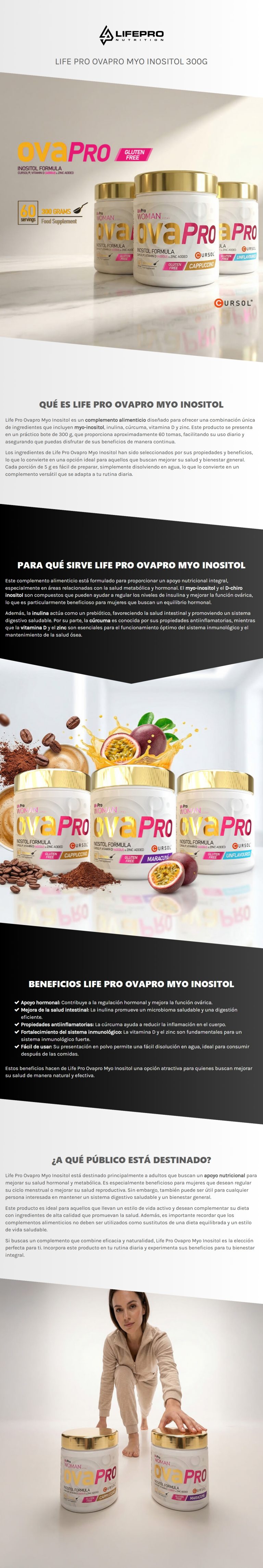 Life Pro Ovapro Myo Inositol es un complemento alimenticio que combina inositol, inulina y cúrcuma para potenciar tu bienestar. Ideal para quienes buscan un apoyo nutricional eficaz y natural.